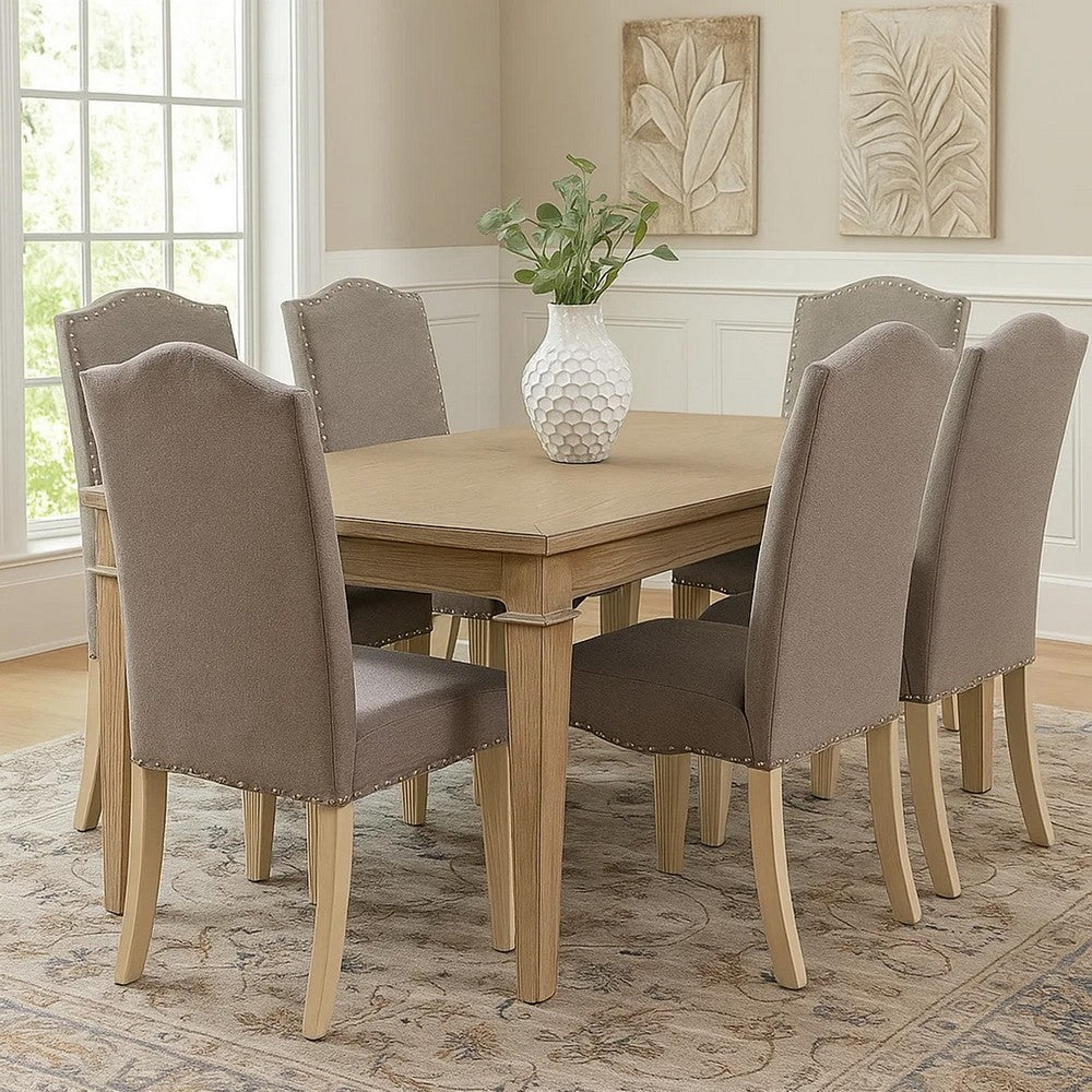 Bring transitional style to your home with this side chair. This side chair have a antique white finish, with fluted legs along its Gray fabric upholstery. Its other features like a nailhead trim, camel back design and sleight curving back give this chair a touch of class.