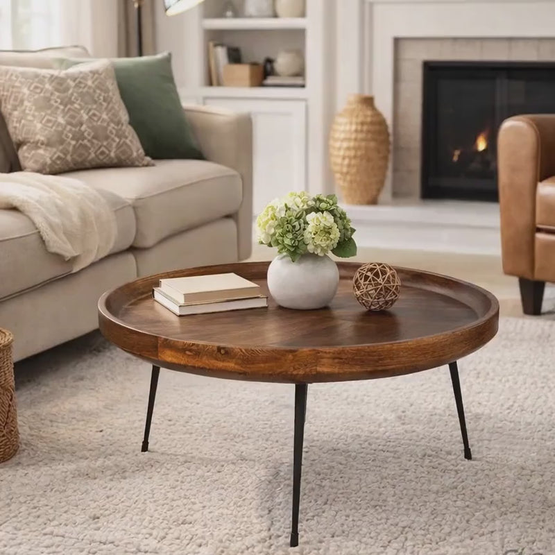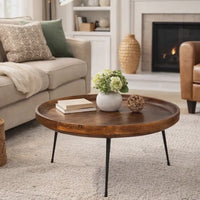 Bring warmth and character to your space with this beautifully handcrafted round tray coffee table made from premium mango wood and supported by strong iron legs. The natural wood grain and rich brown finish make each piece truly one of a kind, while the raised tray edge adds both style and functionality by helping prevent items from slipping.