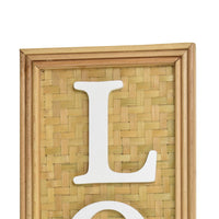 Add a touch of coastal charm to your home with this elegant wall decor sign featuring the word "love" in bold, white script against a woven rattan-inspired background. Crafted from natural elements and encased in a light wood frame, it's the perfect way to bring a romantic, cozy vibe to your boho-themed or casual living space. Check out our Elie collection for more available options.