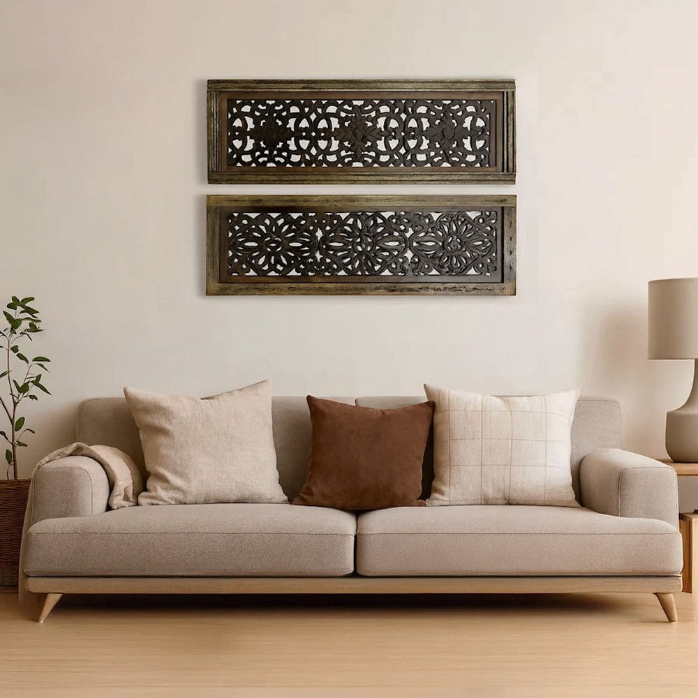 These wall panels are designed with the vision of providing a decorative edge to your plain walls. It comes in a assortment of two and reflects finely designed craftsmanship. Each panel has aesthetic carvings along with aged brown finish. Use these panels together or individually in different rooms as they are going to reflect an amazing visual design.