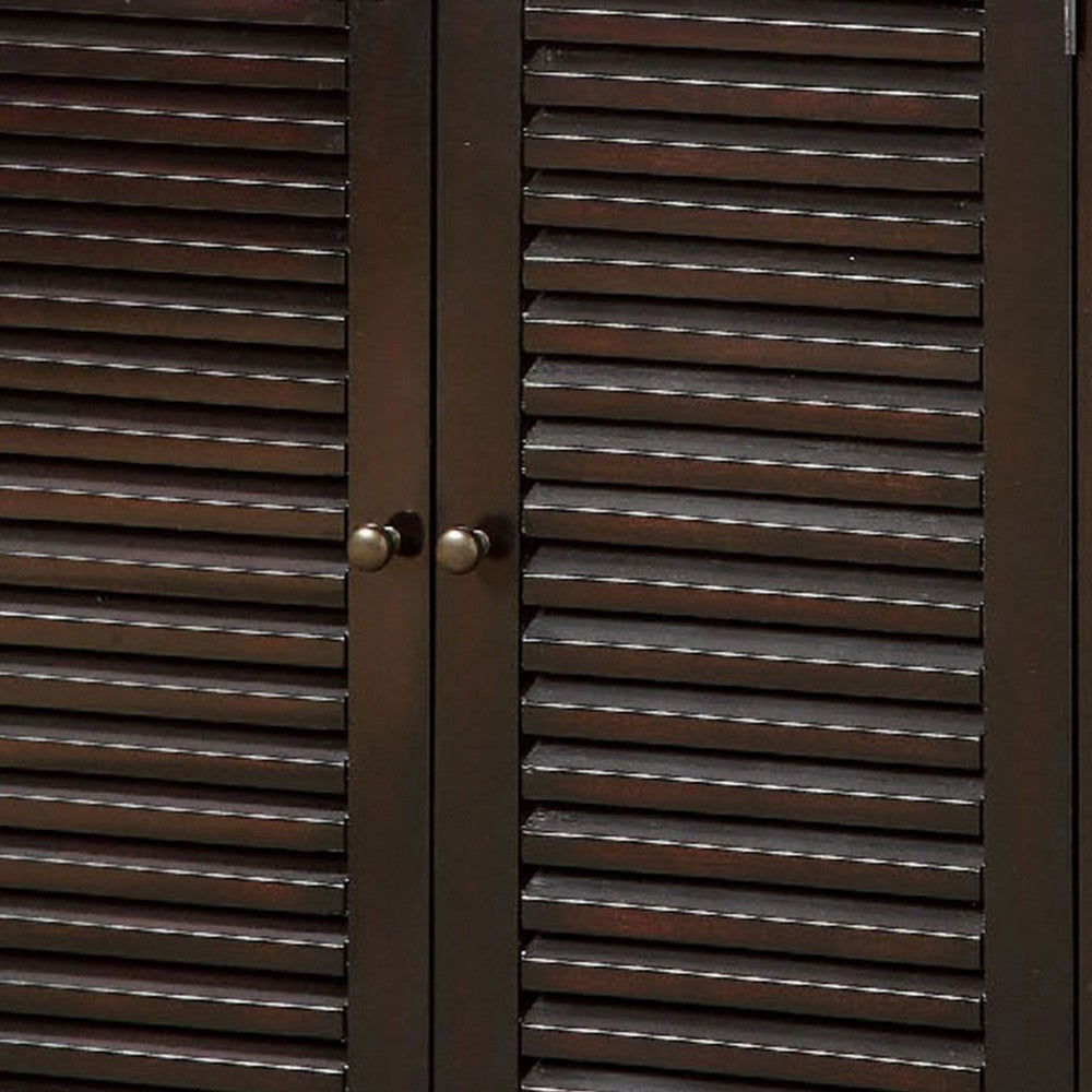 Organize all your favorite footwear in style with this beautiful shoe cabinet. Made up of solid wood and veneer, its complete structure and espresso brown finish is adding a harmony and vintage look to this functional cabinet. Behind the two door, it has five adjustable shelves. The doors features a louver art design so that the air can easily move in and out to let your expensive footwear breathe easily. The flat table top can be used to keep vases, books, photo frames and more to use its purpose to the most. Place this shoe cabinet in your hallway or entrance area and it will give a beautiful look.