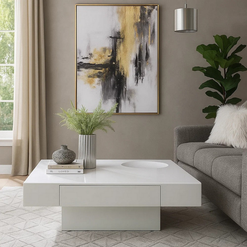 Brighten your living space with the Keya coffee table, featuring a sleek high-gloss white finish for a modern, polished look. Crafted from durable MDF and composite wood, it offers a sturdy 43-inch square top and solid block base for lasting stability. Perfect for contemporary interiors. Check out our Keya collection for more options.