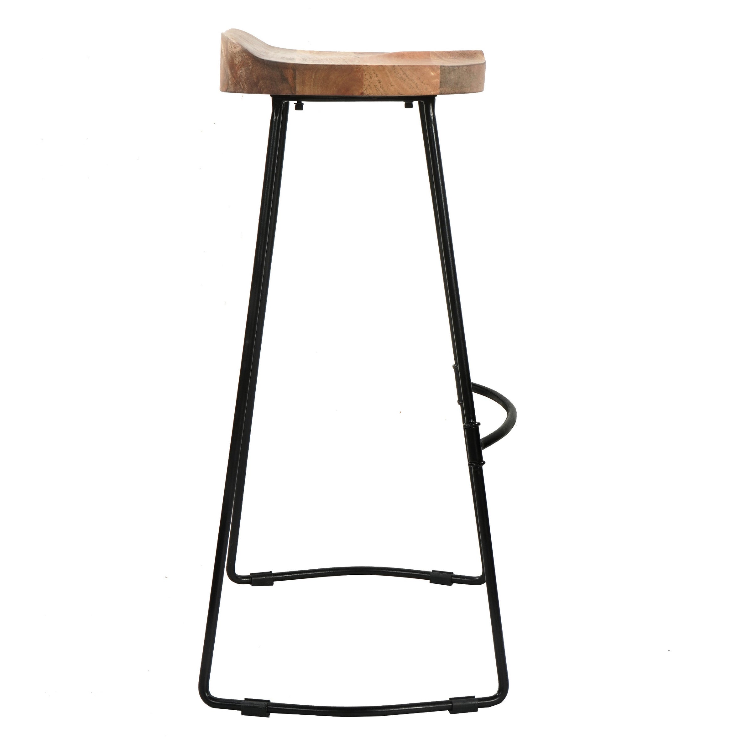 Charmingly naturalistic and gorgeously designed, this 30" handcrafted wooden barstool lends a rustic yet industrial vibe to any home. Handcrafted from premium-grade mango wood for lasting durability, this piece includes an ergonomic natural brown saddle seat for deep, sturdy comfort, a black powder-coated metal frame with excellent strength, and a strong spacer footrest. It has floor protectors along the bottom that prevent damaging scratches or abrasions along the floor while keeping the stool stationary. The backless design creates a subtle home accent, allowing easy, convenient space-saving and compartmentalization. Check out our Tiva collection for more sizes and matching pieces.